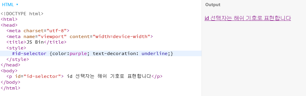 ID 선택자를 쓸때는 .(마침표) 기호 대신 #(해시)기호를 사용하며 요소에는 ID속성만써주면 됩니다.