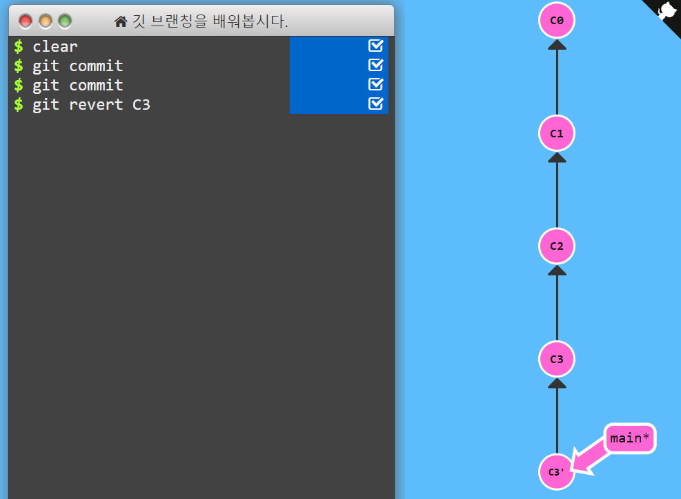revert 대상 커밋은 사라지지 않으며, revert 대상 커밋의 내용을 되돌린 새로운 커밋이 생겨난다.