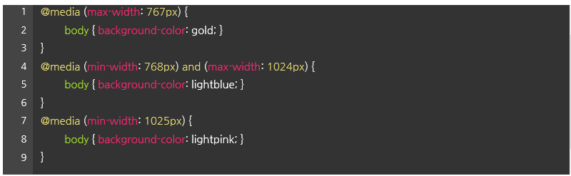 위 코드의 경우, 3개의 조건을 만족하기 위해 3개의 미디어 쿼리를 작성했습니다.