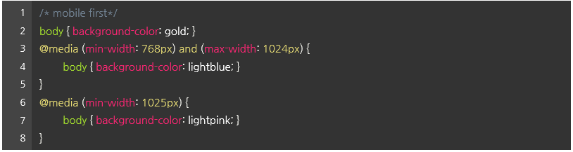↓mobile first인 경우 : mobile(767px 이하)에 대해 미디어 쿼리를 선언하지 않고 body 자체에 background color를 지정