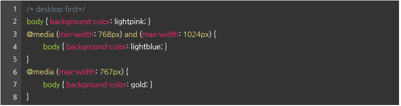 ↓desktop first인 경우 : desktop(1025px 이상)에 대해 미디어 쿼리를 선언하지 않고 body에 background color 지정.